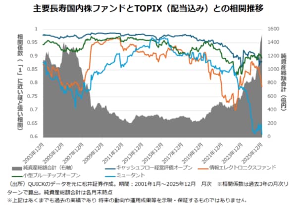 これらのファンドがどのようにアクティブ度合いを高めているかは「アクティブシェア」など様々な尺度で測る必要もあるが、TOPIX配当込みとの相関推移は簡易的であれ、アクティブ度合いの変遷を知るのには有効だ。なお、「ミュータント」や「情報エレクトロニクスファンド」の場合、2000年代前半はTOPIX配当込みとの相関が低かったが、その後、相関が強くなり、足元、相関が低くなっているのが分かる。