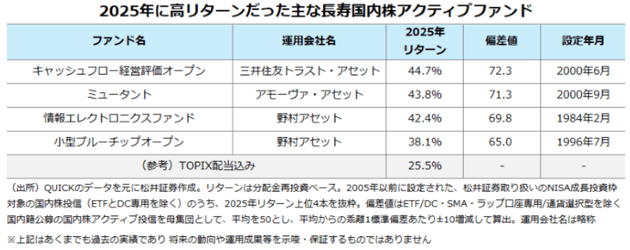 下の表は運用期間が昨年末時点で20年以上ある国内株ファンドのうち、2025年の運用成績上位のファンドをピックアップしたものだ。これら4本は、松井証券が取り扱う国内株アクティブファンドの2025年リターンランキング上位10本にもランクインしている。受験シーズンでもあるので、昨年のリターンが国内株のアクティブファンドの中でどのくらい良かったか、「偏差値」でも示してみた。軒並み65以上という、超一流大学の入学難易度並みの偏差値だった(偏差値の算出方法は表の注記を参照)。