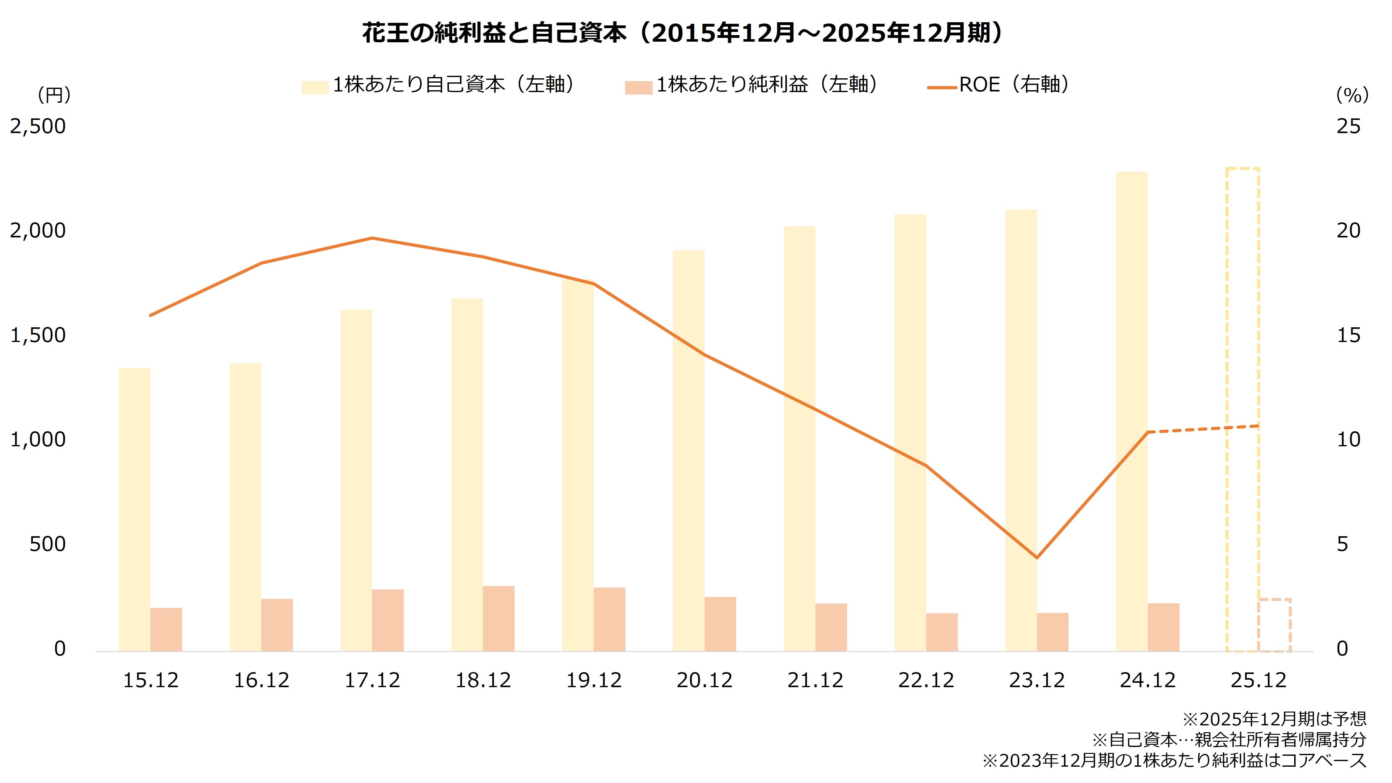 ただし、花王は減益が続いたとはいえ黒字を確保したため、自己資本は増加を続けています。24年12月期は1兆668億円と、19年12月期(同8577億円)より2割以上増えている状況です。計画の目標年度である27年12月期では、自己資本はさらに増加しているでしょう。過去最高益を達成したとしても、ROEは当時を下回る公算です。