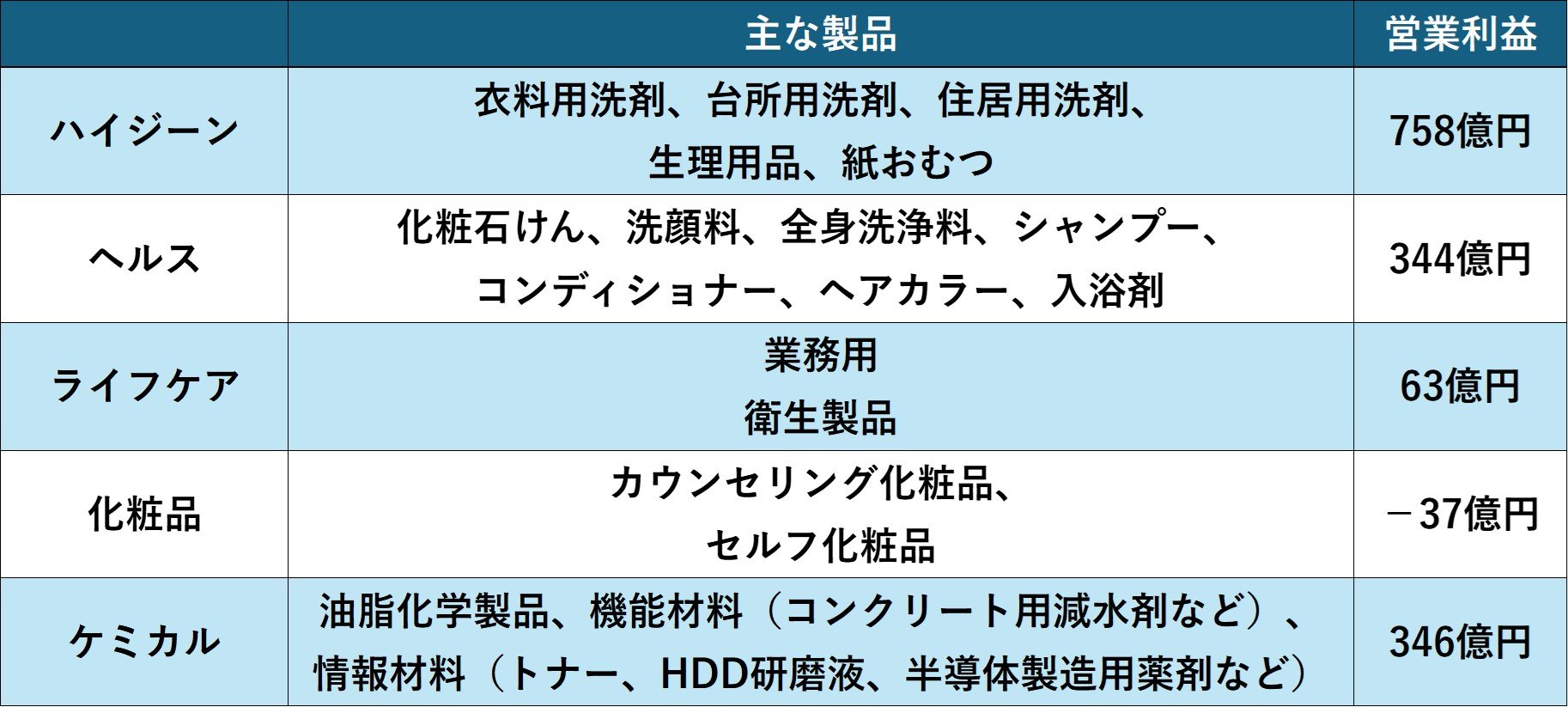 事業別では化粧品事業が注目です。ROIC(投下資本利益率)経営を導入する花王は対資本での利益率を重視しますが、その改善には化粧品事業のテコ入れが急務となっています。