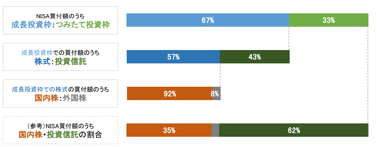 各投資枠の中身を見ていこう。成長投資枠ではその半分以上(57%)で株式が買われている。さらにその株式の92%が国内株であり、外国株はわずか8%に過ぎない。一方、投資信託の買付額は43%。成長投資枠でしか買えない投資信託もあることが影響しているのだろう。成長投資枠は個人投資家のニーズに合わせて柔軟に活用されていることがうかがえる。