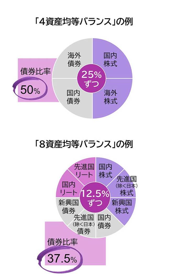 その意味で、私は「資産均等」を謳ったバランスファンドバランスファンドは選ばないと思います。下図のように多くの場合、これらのタイプは債券の比率が、私にとっては低すぎるからです。