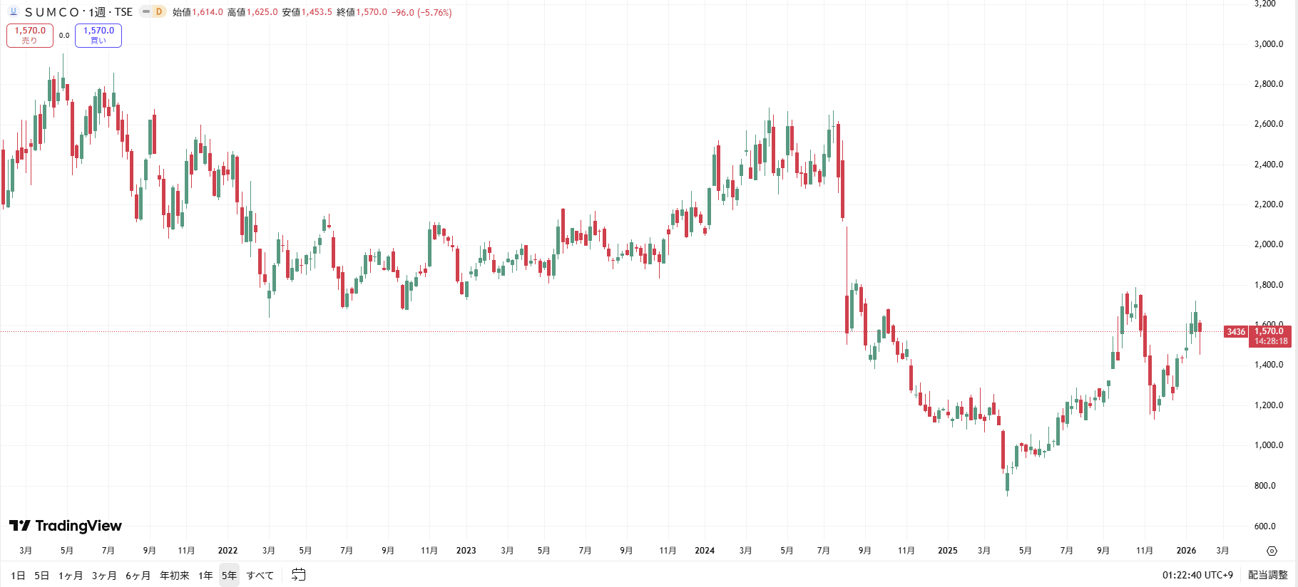 【SUMCOの株価チャート(過去5年間)】