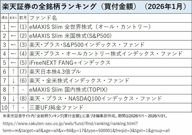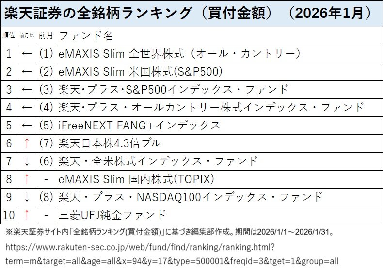 楽天証券の投信売れ筋(買付金額)ランキングの2026年1月のトップ5は前月と同じでトップに「eMAXIS Slim 全世界株式(オール・カントリー)」(愛称:オルカン)、第2位以下は「eMAXIS Slim 米国株式(S&P500)」、「楽天・プラス・S&P500インデックス・ファンド」、「楽天・プラス・オールカントリー株式インデックス・ファンド」、そして、「iFreeNEXT FANG+インデックス」だった。前月第7位だった「楽天日本株4.3倍ブル」が第6位に上がり、トップ10圏外から「eMAXIS Slim 国内株式(TOPIX)」が第8位に、「三菱UFJ純金ファンド」が第10位にランクインした。