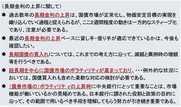 図表3の上2つは、まさに最近の長期金利の上昇に注意が必要という趣旨の意見です。その下の「これまでの考え方に沿って、減額と異例時の増額等を行うべき」、「例外的な状況においては、国債買入れも含めた柔軟な対応の検討が必要」は、長期金利上昇への対応に関する公式見解に沿った意見と言えます。