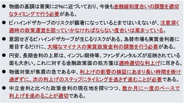 まず、(1)に関しては、「適時の政策運営を図っていかなければならない度合いは高まっている」、「あまり長い時間を掛け過ぎずに、次の利上げのステップにタイミングを逃さず進むことが必要」などが目立ちますが(図表1)、円安というより、利上げが後手に回り(ビハインドザカーブ)、インフレを高めるリスクを意識したものが多いのが特徴です。