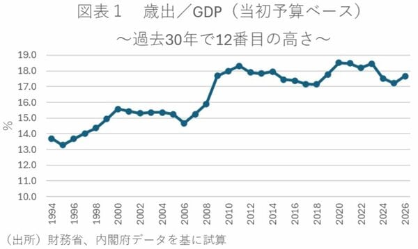 一方、エクスパンショナリー(Expansionary)とは拡張的を意味し、単に景気を下支えするために支出規模を膨らませるだけの政策ではない、という否定である。これは、「規模(量)の追求」から「投資先(質)の追求」へシフトしたことを強調し、財政規律を重視する国際社会に配慮した表現と言える。そして実際に、26年度当初予算ベースの歳出額(GDP比)は過去30年間では12番目の高さにとどまっている(図表1)。