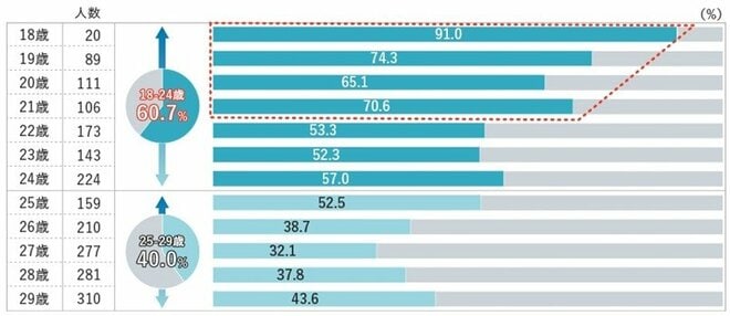 特に18-21歳で顕著に高い傾向にあり、18歳では約9割に上ります。
