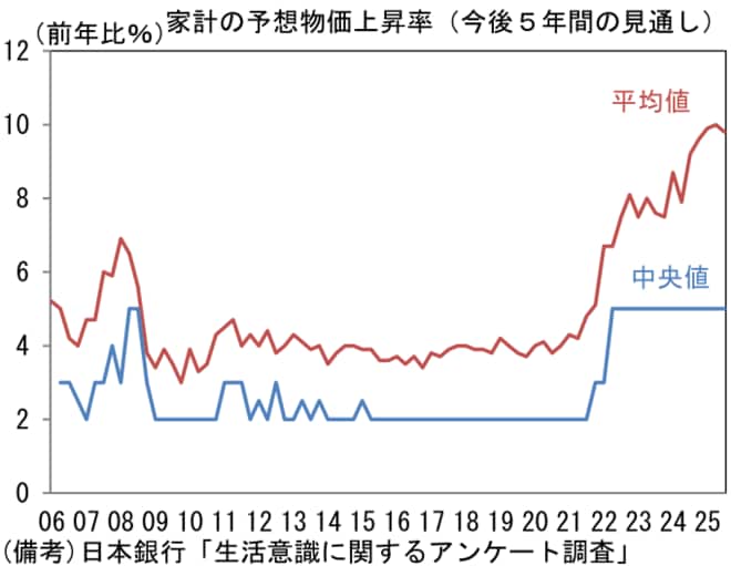 →「生活意識に関するアンケート調査」(日銀)によると、消費者の予想する物価上昇率は中央値でみれば横ばい状態である一方、平均値は10%近傍で高止まりしている。また不動産価格に言及した点は、過度な金融緩和が消費者の経済厚生を圧迫しているとの認識があるのかもしれない。