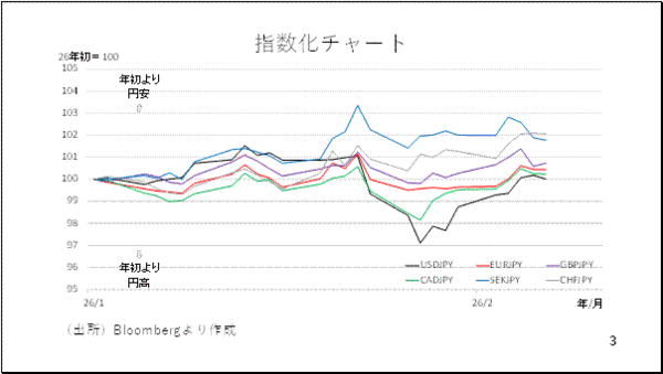 年初来のドル円やクロス円の指数化チャートをみると、レートチェックを受けて総じて円が全面高となりましたが、そうした円高が先週 27 日に一服していた点を前回の動画でお伝えしました。ドル円に限ればドル安が続いた結果、低迷していましたが、そのドルが持ち直した結果、ドル円も年初の水準を概ね回復しました。