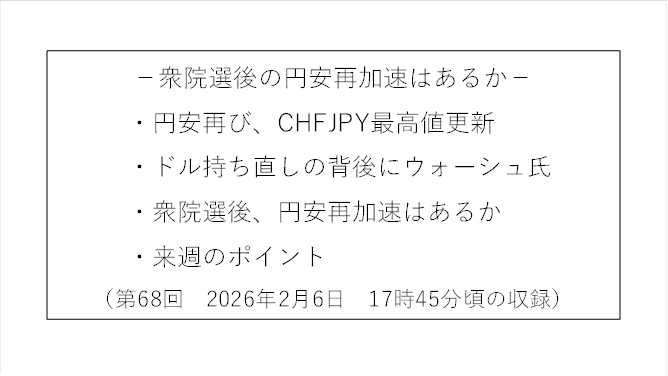 また、FRB 議長にウォーシュ元 FRB 理事が指名されると、過去に量的緩和(QE)に反対を表明したことから想定よりもタカ派の人物と受け止められ、ドル高を招きました。その他では高市総裁の街頭演説も一部が円安容認と受け取られ、総じてドル円相場が大きく反発しています(スライド 2)。