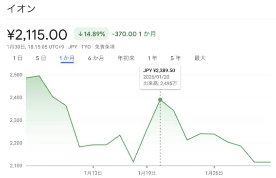 このニュースが出た際、関連が深いとされるイオンの株価は一瞬ピクッと反応して上がりましたが、その後はズルズルと下がってしまいました。
