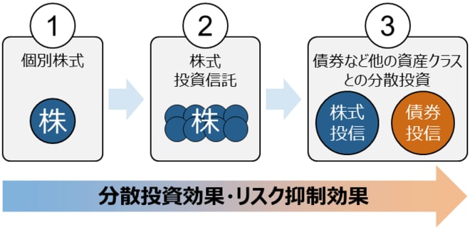 分散投資と言っても段階があります。株式の投資信託は基本的に数多くの銘柄に投資しているので、個別株に投資する(図①の状態)にくらべ分散投資されており、リスクが抑制されています(図②の状態)。ただ、分散されているとは言え、株式全体のリスクはそれ相応に高く、株式同士の値動きは連動しやすい傾向があります。そこで次の段階として資産クラス(同じようなリターンやリスク特性を持つ、投資対象となる資産グループ)が異なる商品に分散することになります(図③の状態)。代表的なものが債券投資です。