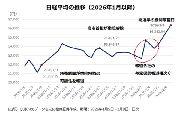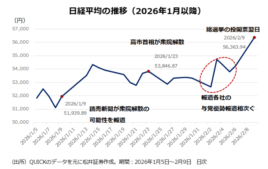 ただ、選挙戦の端緒となったのは、高市首相が通常国会冒頭における衆院解散を検討していることを報じた、1月10日付(インターネット配信は前日夜)の読売新聞のスクープだ。同報道を受け、3連休明け、1月13日の日経平均は3.1%の大幅上昇となった。また、それを上回る3.9%の上昇となった2月3日は、米国株式相場の上昇に、メディアの情勢調査で自民優勢が伝わったことも重なった結果だ。