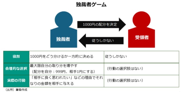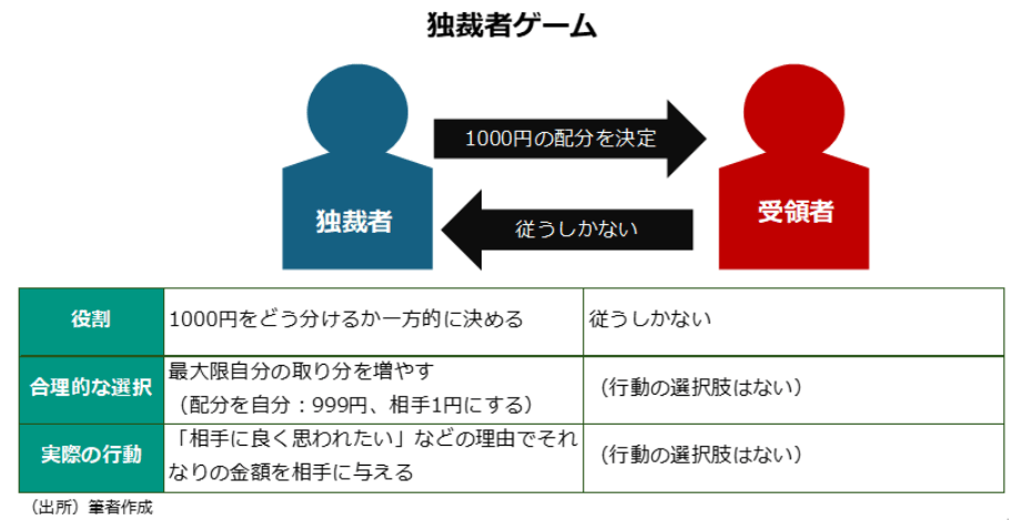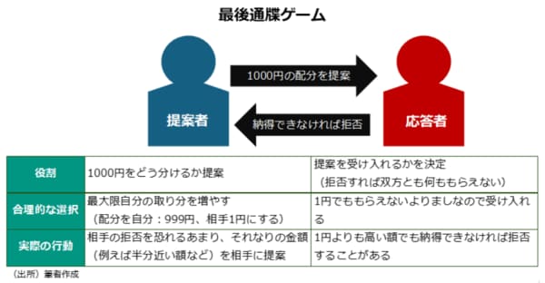 例えば1000円を2人で分けるとしよう。合理的に考えれば、提案者は「999円が自分、相手が1円」という配分にするだろうし、もう片方は、「1円でももらえないよりはマシ」だから、それを受け入れるだろう。しかし、実際に実験をしてみると、提案者は相手にそれなりの取り分を与えることも多く、もう片方は1円より多い額でも、受け取りを拒否するケースも多いとされる。