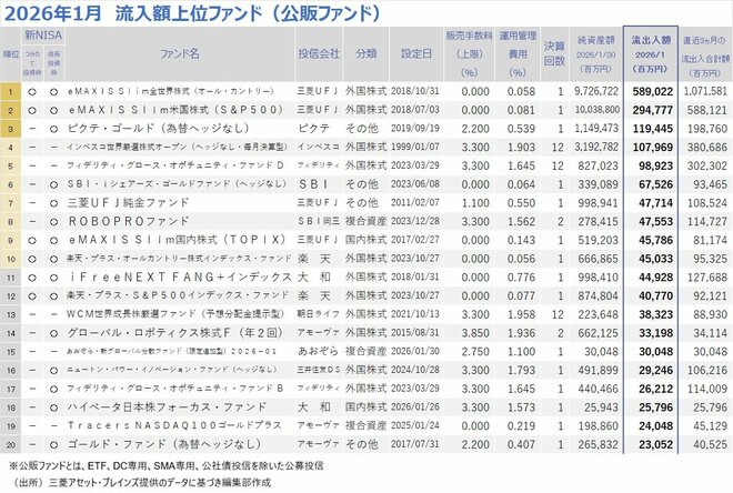 流入額上位20ファンドでは、トップは前月同様に三菱UFJアセットマネジメントが設定する「eMAXIS Slim 全世界株式(オールカントリー)(愛称:オルカン)」(流入額5890億円、前月2875億円)だった。「オルカン」への資金流入超過額は年末と比較してほぼ倍増した。2024年1月の3539億円、2025年1月の3758億円をも上回る歴史的な流入超過額となった。