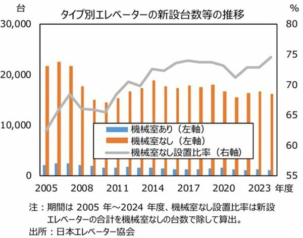 神様:その通りです。エレベーターの税法上の法定耐用年数は17年ですが、一般的な寿命は20年~30年と言われています。25年~30年以上経過している油圧式エレベーターはリニューアルの時期に差し掛かっています。これらの多くは、おそらく機械室を作る必要がなくコンパクトな最新のロープ式エレベーターに入れ替わるでしょう。全国で工事が進んでいくと思われます。