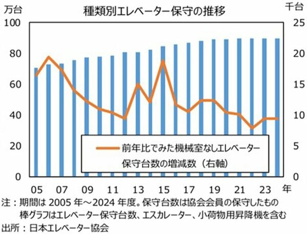 神様:一般社団法人日本エレベーター協会によると、2024年度のエレベーター保守台数は687,078台となっています。調査を始めた1970年は約42,000台でした。