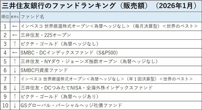 三井住友銀行の投信売れ筋ランキングの2026年1月のトップ2は前月と同じ「インベスコ 世界厳選株式オープン<為替ヘッジなし>(毎月決算型)<世界のベスト>」、「三井住友・225オープン」だった。このトップ2は2025年10月以来4カ月連続で続いている。第3位には「ピクテ・ゴールド(為替ヘッジなし)」が上がった。「ピクテ・ゴールド(為替ヘッジあり)」は第9位にもランクインしており、「ゴールド」への関心の高まりを感じさせる。一方、2025年11月までは第3位にランクされていた人気ファンドの「SMBC円資産ファンド」は第6位にまで後退し、「GSグローバル・パーシャルヘッジ社債ファンド」も第10位にランクダウンするなど、「安定」をめざすファンドへの支持が下がった。