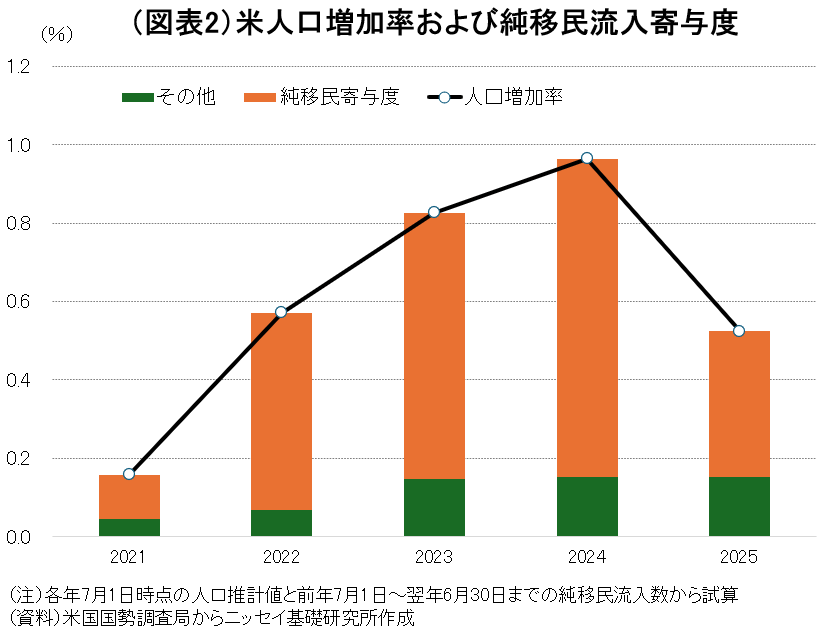 移民流入の減少は人口統計にも反映されている。米国国勢調査局によると、25年7月1日時点の人口増加率は0.5%と前年同期の1.0%から半減した(図表2)。このうち、純移民流入人口の寄与度は24年の0.8%ポイントから25年に0.4%ポイントへ大きく低下しており、人口増加率の鈍化は主として移民減少によるものである。米国では自然増による人口増加率が低位にとどまるなか、移民人口の動向は今後の人口増加率を左右する重要な要因となろう。