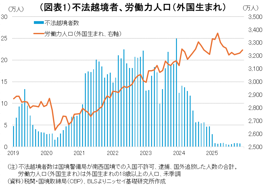 実際、南部国境からの不法越境者数は、バイデン前政権時代に月次で25万人のピークをつけたものの、トランプ政権2期目のスタート後、2025年2月以降、1万人を割る水準まで急減した(図表1)。こうした移民流入(フロー)の減少は、外国生まれの労働力人口というストックにも明確に表れており、25年3月に3,372万人のピークを迎えた後、12月には3,243万人と、ピークから▲129万人減少した。