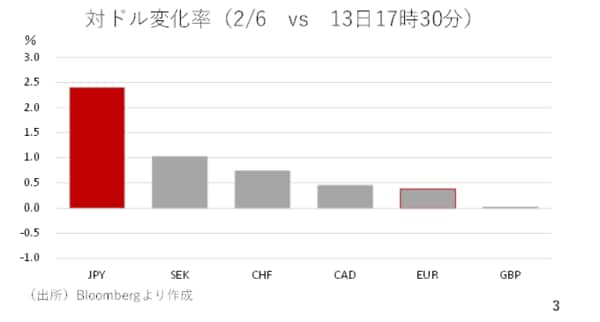 もっとも、今週の米国債は値上がり(長期金利は低下)しており、実際にそのような米国債離れの動きが見られたわけではありません。一方、上昇した通貨の中で最も上昇したのが円です。今週はドル安と円高が合わさった結果、ドル円相場が値幅を伴って下落したことになります(スライド3)。