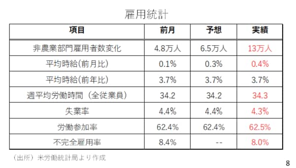 また週平均労働時間も伸びており、それだけ仕事が忙しいということを表しています。労働参加率も上昇しています。これは仕事をしている人および求職者が労働人口に占める割合です。労働参加率の上昇は職を探せば見つかるといった環境を示唆しています。さらに、不完全雇用率も低下しました。これはフルタイムでの勤務を望んでいるもののパートでしか働くことができていない人を失業者としてカウントしたものです(スライド8)。