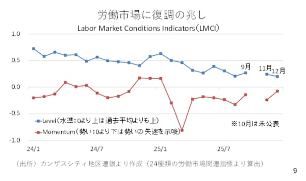 このほか、労働市場に関してはカンザスシティー地区連銀がLMCIという指標を発表しています。これは24種類の労働市場の関連指標から労働市場の現在の水準や勢いを示すものです。