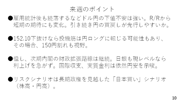 ドル円相場がこの程度の水準にとどまる限り、日銀が利上げを急ぐ必要性も低くなります。実質金利がマイナス圏にとどまる可能性が高く、国際収支面での需給に照らしても円高が定着する環境ではありません。基本的にドル高円安基調が続くと見ています。もっともこうした見方に対する最大のリスク要因は「日本買い」シナリオに転じる場合です。すなわち株高と円高が並走する展開です(スライド10)。