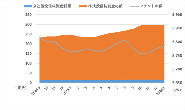 国内公募投資信託(以下、投信)の2026年1月末時点の純資産総額は311 兆 2,559 億円(前月比9兆6,708億円増)と9カ月連続で増加し、8カ月連続で過去最高を更新した(2026年2月13日発表、投資信託協会)。初めて300兆円台に達した前月からさらに約10兆円増加した。資金動向は2兆9,141億円の純資金流入と、8カ月連続で流入超となった。