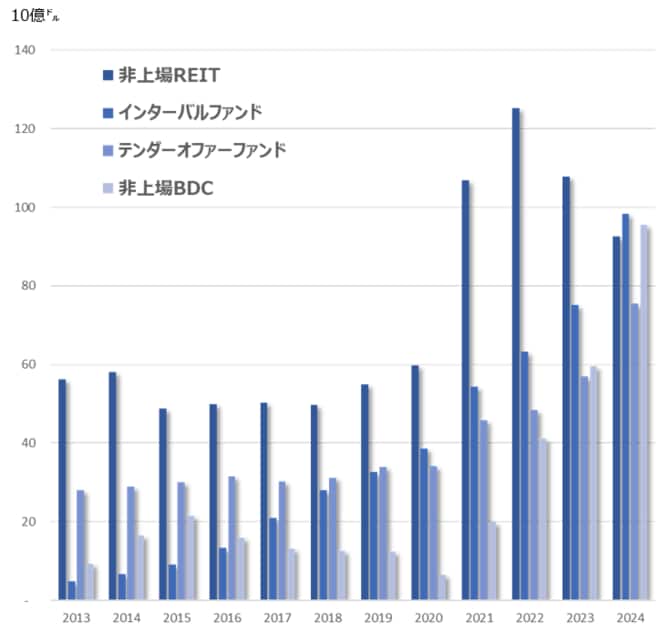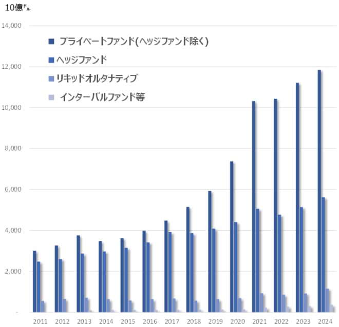 1つ目の棒グラフはオルタナ資産の残高推移で、次の円グラフは2024年末時点の残高の内訳です。プライベートファンド(プライベートエクイティや不動産など)とヘッジファンド、リキッドオルタナ、さらにインターバルファンド・BDCに大別されますが、推移のグラフをご覧いただくと、過去10年間でヘッジファンドやリキッドオルタナが緩やかな増加にとどまるのに対し、ヘッジファンドを除くプライベートファンドが大きく伸びています。また比率こそ小さいもののインターバルファンド・BDC等の残高もこの数年で拡大しています。3つ目のグラフはこれらだけを抜き出したものですが、マーケットがほぼなかったような頃から、広範な富裕層がオルタナ投資の「器(うつわ)」として急速に使うようになったことを反映し急増しています。