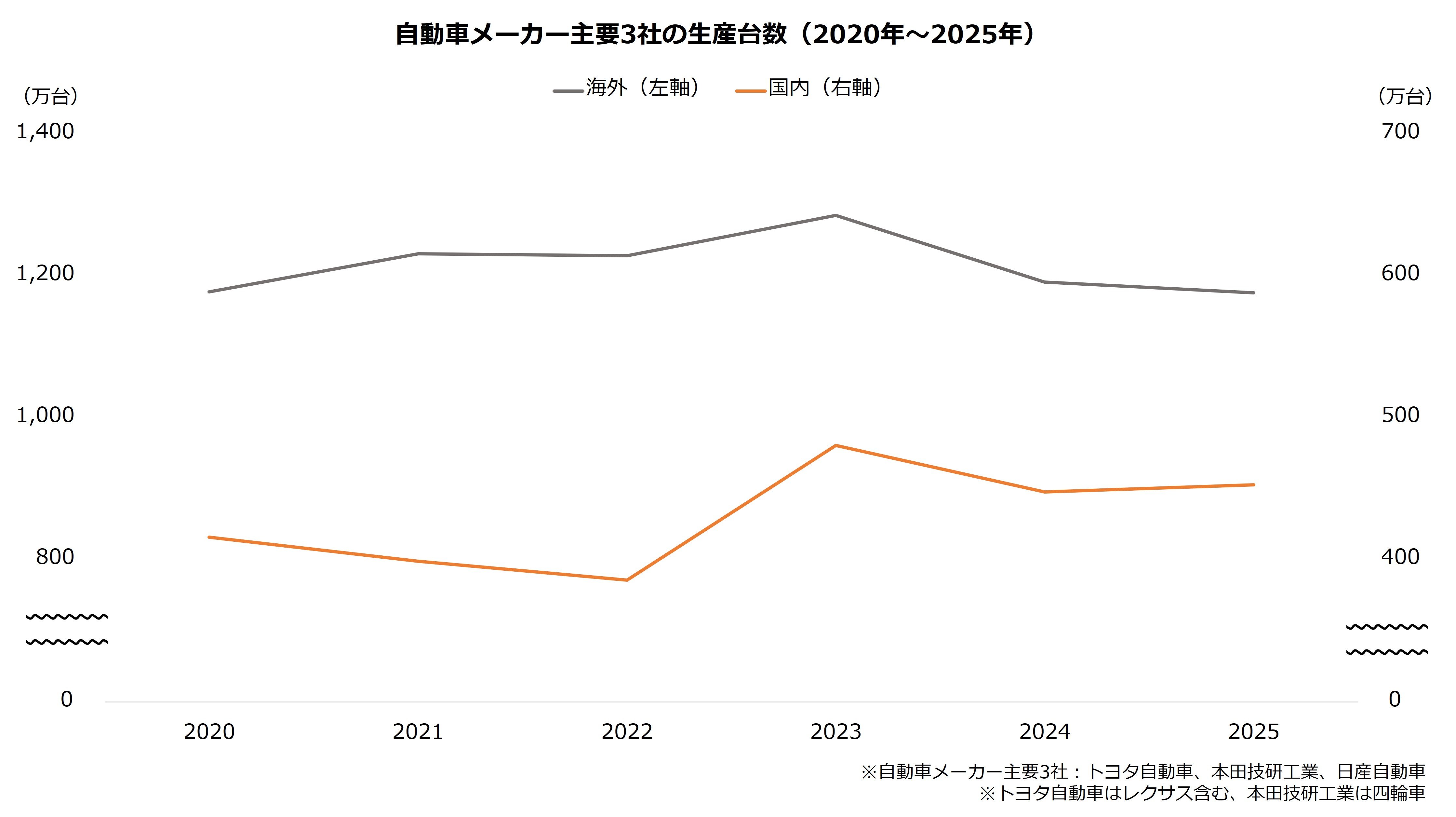 しかし、国内の自動車生産は頭打ち感があります。主要3社(トヨタ自動車、本田技研工業、日産自動車)は23年に大きく生産を増やしましたが、以降は停滞している状況です。海外も同様で、23年以降は生産が減少しています。