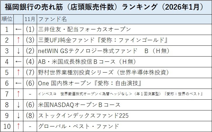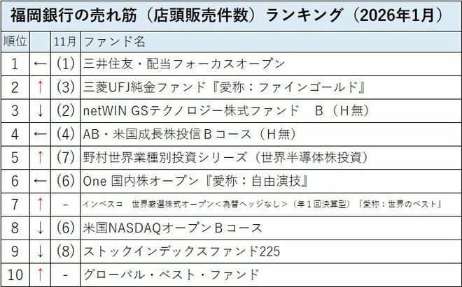 福岡銀行の売れ筋(店頭販売件数ランキング)の2026年1月は、「三井住友・配当フォーカスオープン」、「三菱UFJ純金ファンド(愛称:ファインゴールド)」、「netWIN GSテクノロジー株式ファンド B(H無)」がトップ3だった。「野村世界業種別投資シリーズ(世界半導体株投資)」が第5位に上がり、「インベスコ 世界厳選株式オープン<為替ヘッジなし>(年1回決算型)(愛称:世界のベスト)」が第7位、「グローバル・ベスト・ファンド」が第10位にランクインするなど、外国株ファンドが順位を上げた。国内株ファンドは、トップの「三井住友・配当フォーカスオープン」の他は、第6位に「One国内株オープン『愛称:自由演技』」があるものの、「ストックインデックスファンド225」は第9位に後退した。