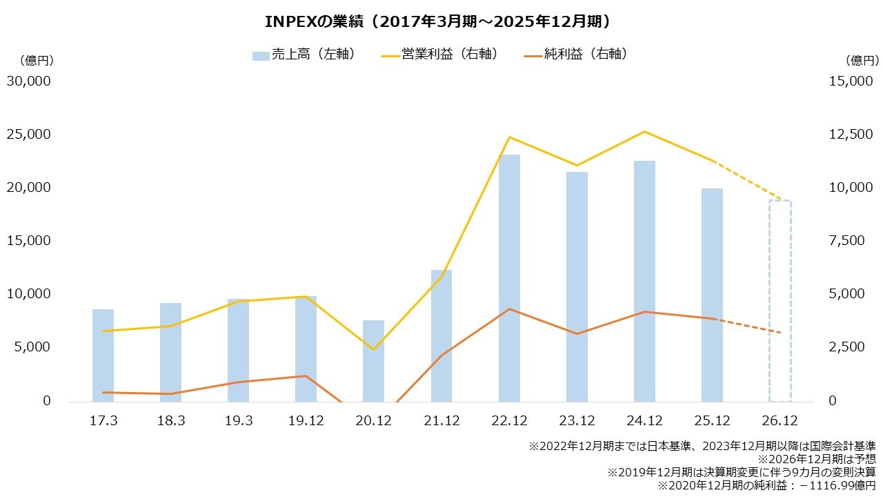 まずは気になる業績の見通しから確認します。INPEXは今期(26年12月期)を減収減益と予想しました。予想どおりとなれば、減収減益は2期連続です。