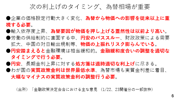 ただ、逆に言えばそこまでの円安の緊張がなければ、次の利上げは前回の利上げから半年が経過した6月、または展望レポートが出される7月となりそうです(スライド6)。