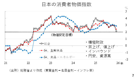 その点、現在の日本のインフレ率は「総合」と「除く生鮮食品」が低下しており、目先は2%を割り込むとみられています。ただし、高市総理は改めて積極財政方針を前面に打ち出しています。一定の需要刺激効果が予想される上、賃上げと値上げが続く見通しです。
