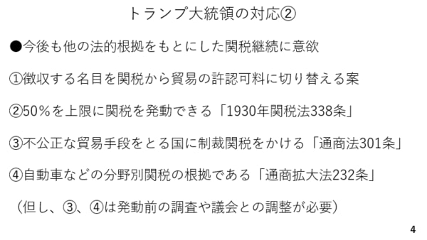 ただし、この内の➂、➃を巡っては、事前の調査や議会との調整が必要とされており、トランプ大統領が独断で発動する事ができる訳ではないようです(スライド4)。