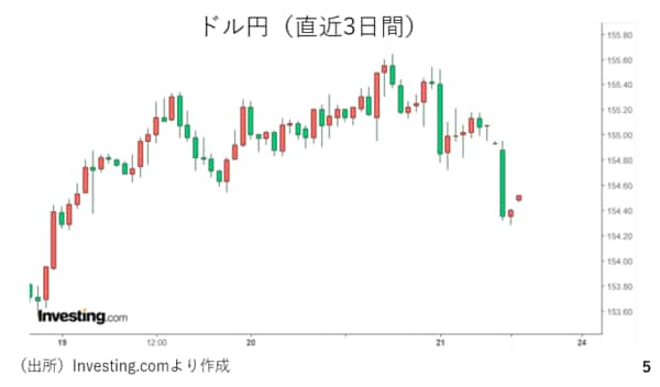 違憲判決を受け、日本時間の日付が変わった21日にドル円相場は155円40銭付近から154円70銭近辺まで下落しました。その後、かろうじて155円台を回復して週末を迎えましたが、週明けの本日23日に154円台前半まで下落した後、現時点では下げ止まっています(スライド5)。