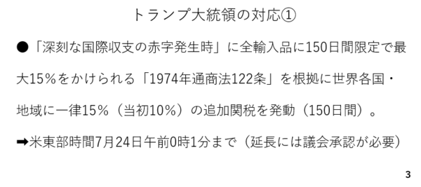 トランプ大統領は今回の判決を受け、すぐに1974年通商法第122条を根拠とする追加関税を発動しました。これは深刻な国際収支の赤字が発生した際に発動されるもので最長150日間と定められています。税率に関し、トランプ大統領は当初10%としましたが翌日にはこれを15%に引き上げています。米東部時間7月24日午前0時1分まで有効とされていますが、その延長には議会の承認が必要です(スライド3)。