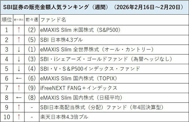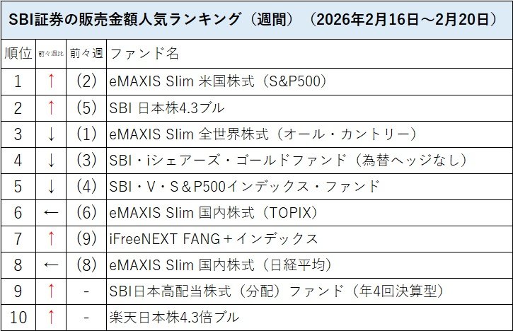 SBI証券の投信販売金額人気(週間)の2026年2月第3週(2月16日~2月20日)のトップは「eMAXIS Slim 米国株式(S&P500)」だった。第2位は「SBI 日本株4.3ブル」で、第1週にはトップだった「eMAXIS Slim 全世界株式(オール・カントリー)」(愛称:オルカン)は第3位に後退し、「SBI・iシェアーズ・ゴールドファンド(為替ヘッジなし)」も第4位に下がった。「iFreeNEXT FANG+インデックス」が第7位に上がり、トップ10圏外から「SBI日本高配当株式(分配)ファンド(年4回決算型)」が第9位に、「楽天日本株4.3倍ブル」が第10位にランクインした。一方で「Tracers NASDAQ100ゴールドプラス」や「三菱UFJ純金ファンド」はトップ10から落ちた。