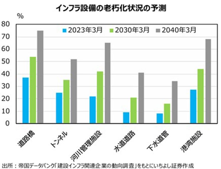 神様:道路、橋、トンネル、上下水道など、日本のインフラ設備は1970年代の高度経済成長期に建設されたものが多く、建設後50年目に差し掛かろうとしています。「建設後50年目」は、更新の目安でもあるのです。帝国データバンクは、こうしたインフラ設備が建設後50年を超える割合は今後急速に高まる見込みであることを指摘しており、日本全国のインフラ設備の老朽化が懸念されています。