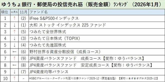 ゆうちょ銀行・郵便局の売れ筋(販売金額・1カ月)の2026年1月のトップは「iFree S&P500インデックス」になった。11月のトップだった「大和ストックインデックス225ファンド」は第2位に後退し、11月は第5位だった「つみたて全世界株式」が第3位に上がった。「つみたて日本株式(TOPIX)」は11月の第3位から第4位に下がるなど、国内株インデックスファンドが後退し、外国株インデックスファンドが順位を上げた。第6位以下のバランス型ファンドでは、「JP4資産バランスファンド 成長コース」が11月の第9位から第7位に上がるなど、株式などリスク資産に多く資産配分し、積極的にリスクを取るタイプのファンドが人気になった。