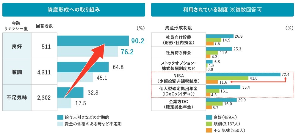 まず注目すべきは、資産形成への取り組み姿勢です。金融リテラシー度が高い層は、資産形成に対して積極的で、定期的な積立を行う割合が顕著に高いことがわかりました。(図表1左)では、「良好」層の9割以上が給与天引きなどで積立を実施しており、これは「不足気味」層と比べて大きな差となっています。
