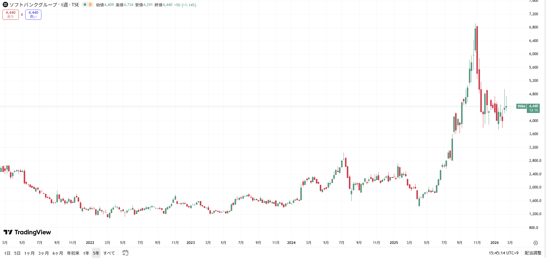 【ソフトバンクグループの株価チャート(過去5年間)】