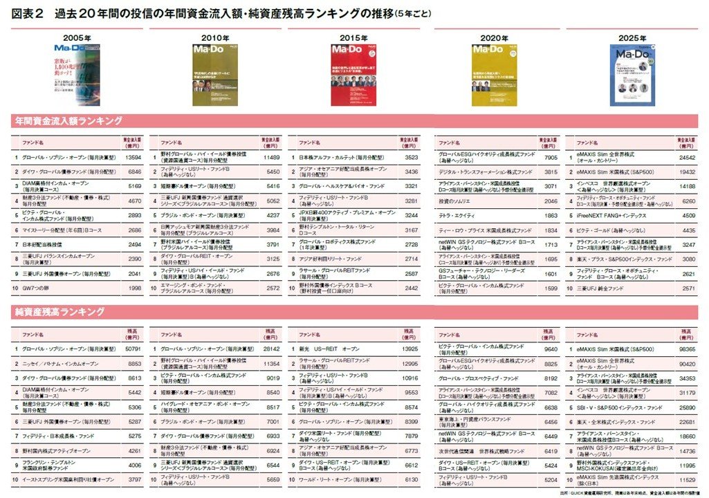 ここからは、2005年以降のETFを除く追加型株式投信の資金流入額(年間)と純資産残高(年末時点)のランキングを、それぞれ5年ごとに見ていきたい(図表2参照)。窓販の絶頂期とも言える2005年の資金流入額で1位になったのは「グローバル・ソブリン・オープン(毎月決算型)」。清家氏の指摘を表すように、上位5ファンドはすべて毎月分配型だった。残高の1位も「グローバル・ソブリン・オープン(毎月決算型)」で、同ファンドは「グロソブ」の通称で人気を博し、窓販を象徴する商品とも言われた。