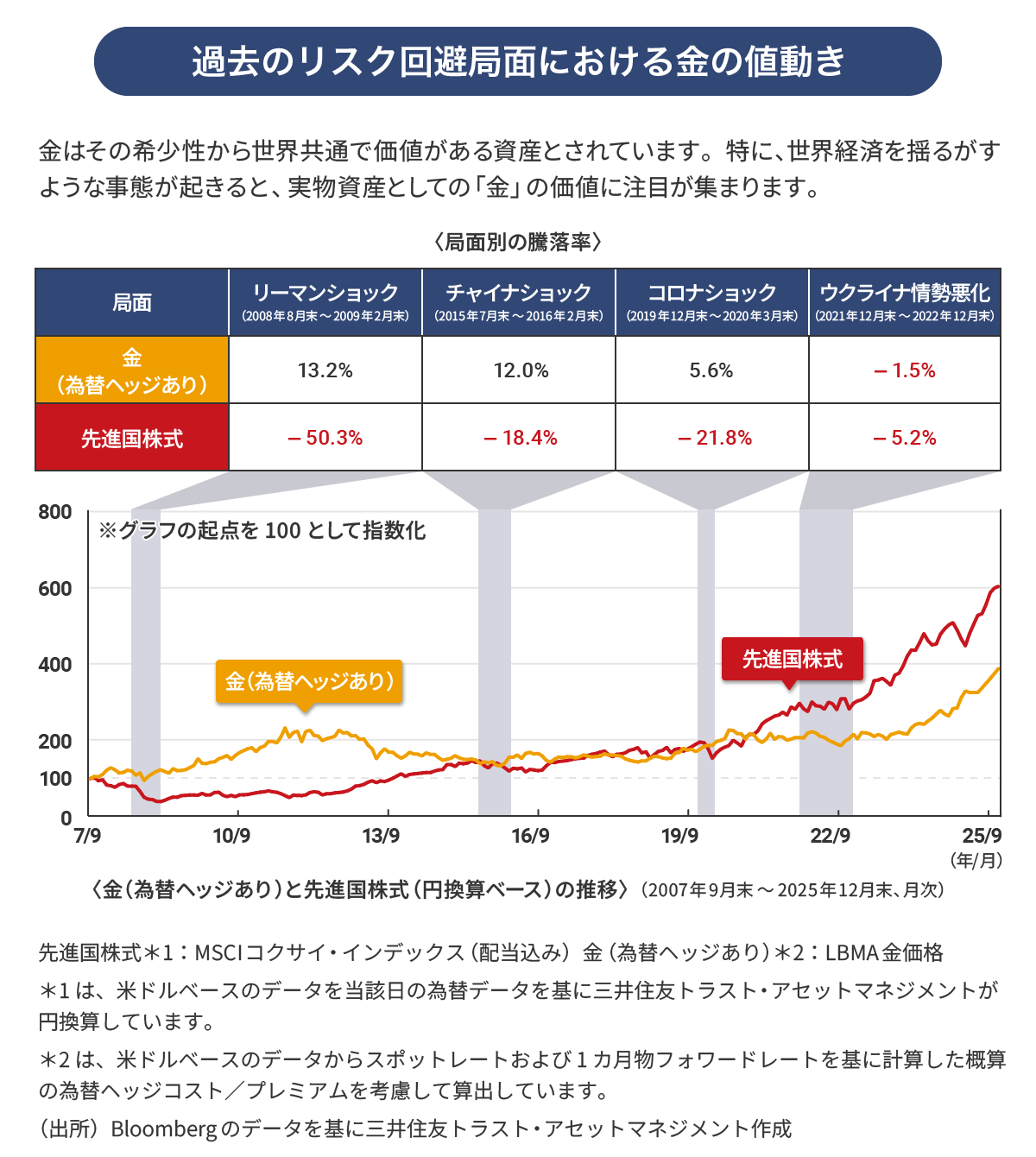3つ目は「金の戦略的活用」です。金は他資産との相関が低く、金融危機や地政学リスクが高まる局面などでは「有事の金」として選好され、資金の逃避先として買われる傾向にあります。市場急変時にポートフォリオを下支えする効果があり、分散投資の観点から極めて有効な資産と言えます。なお、「グローバル経済コア」では、金の基本投資比率を15%とし、10~20%の間で調整します。