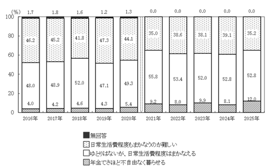 2025年の結果を見ると、年金で「日常生活費程度もまかなうのが難しい」と感じる人が35.2%に達する一方で、「ゆとりはないが、日常生活程度はまかなえる」と答えた人が52.8%と過半数に上った。さらに、「年金でさほど不自由なく暮らせる」という人は12.0%となっている。