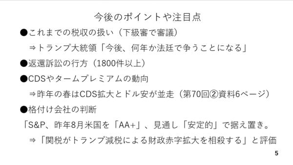マーケットに関しては引き続きCDSやタームプレミアムの動向に注目です。昨年の春はトランプ減税の恒久化に伴い予想される財政悪化への懸念からCDSのスプレッドが拡大し、それとともにドル指数が下落しています。その他、格付け会社の判断も重要です。