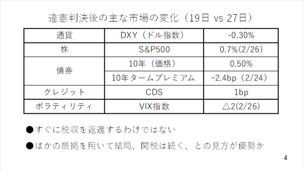 また、政府の財政に対する懸念度合いを示すタームプレミアムやCDSのスプレッドを見ても概ね横ばい圏で推移しました。恐怖指数とされるVIX指数も小幅に低下しています。結局、市場はこれまで受け取った税収をすぐに返還するわけではなく、ほかの法的根拠をもとに関税も続くとみていると考えられます(スライド4)