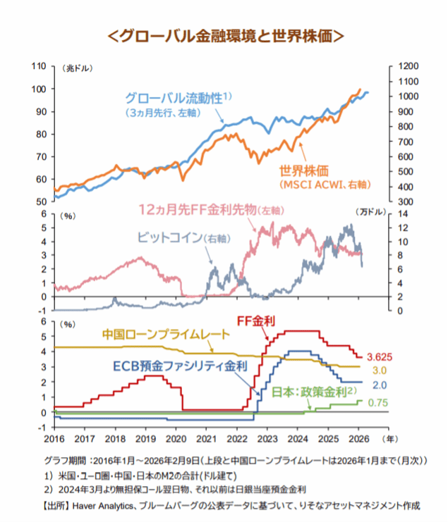 昨年10月をピークにマグニフィセント7に代表される米国の超大型成長株の騰勢が鈍り始めました。代わって、出遅れていた業種や割安株が相場の牽引役となっています。主要株価指数の動きでは、世界株価指数(MSCI ACWI)が直近まで最高値を更新する一方、超大型成長株の比重が高いナスダック総合指数は昨年10月に付けた最高値を更新できていません。ビットコインも昨年10月の高値が抜けず、足元、半値水準まで調整しています。米国超大型成長株とビットコインの共通点は、23年以降、価格が急騰したこと、そして、市場の流動性環境に敏感なことです。